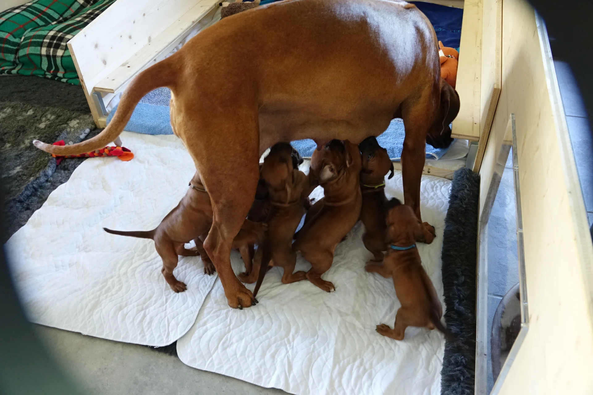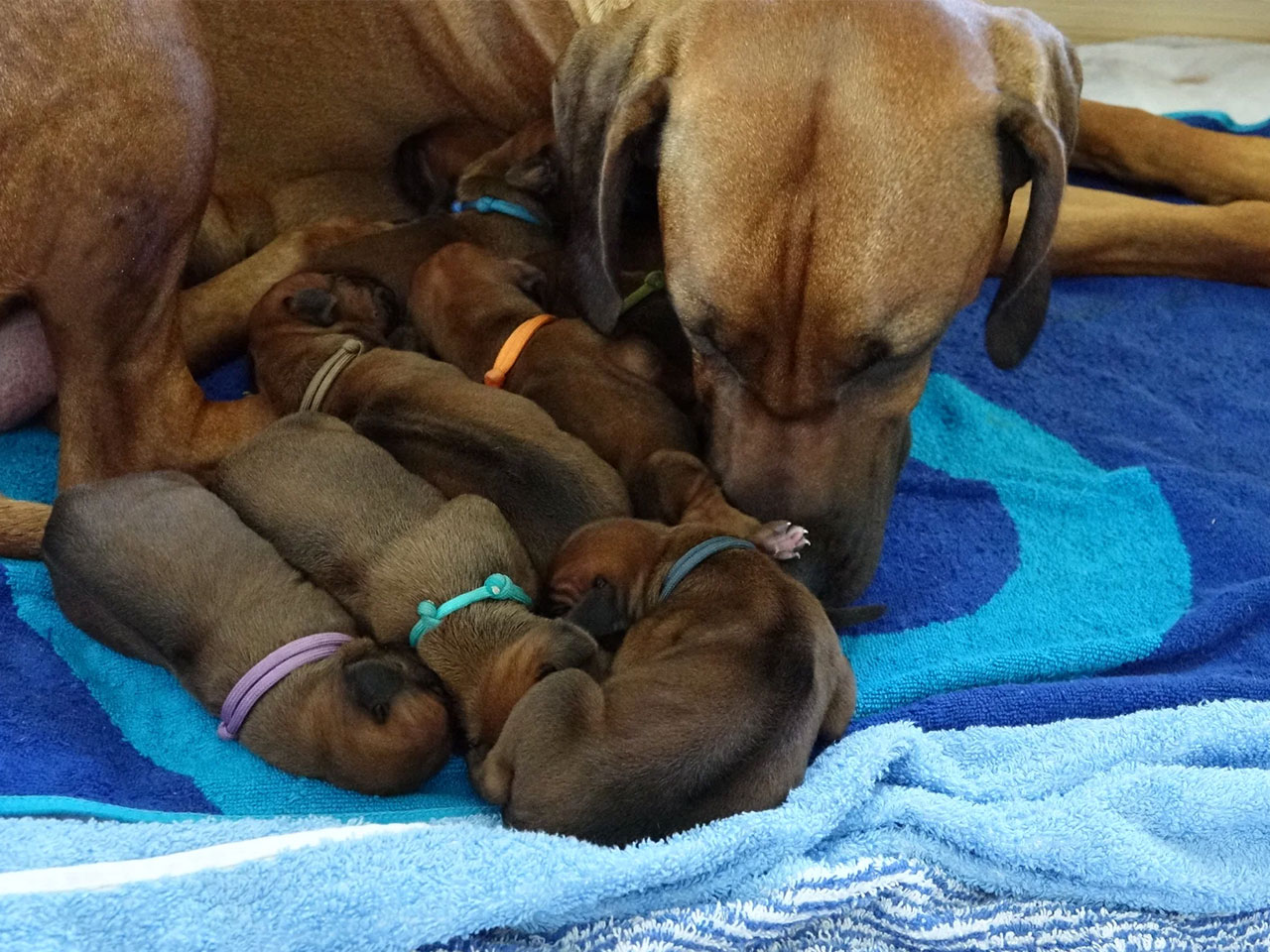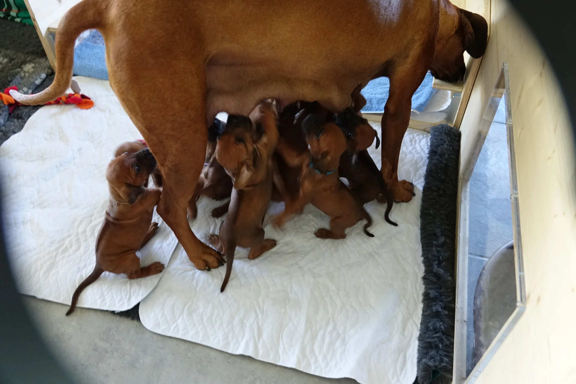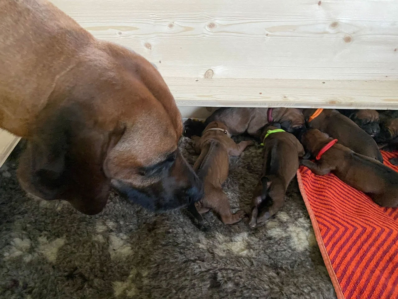 Am 08. Juni 2023 ging es mit unserem ersten Wurf Maniema Aziz (kostbar) los. Um 15:30 kam der erste Welpe auf die Welt. Der vermeintlich Letzter um 23:00 Uhr. Der Ultraschall wie auch das Röntgenbild zeigte 9 Welpen. Doch welche Überraschung; um 23:44 Uhr purzelte der zehnte Welpe in meine Hand. 5 Rüden und 5 Hündinnen hat uns Maisha geschenkt. Obwohl es ihr erster Wurf ist pflegt und hegt Maisha die Welpen vorbildlich. Am ersten Tag durfte sogar Papa Kipanga die Welpen kurz besuchen. Wir sind gespannt wie sich die Kleinen entwickeln werden.